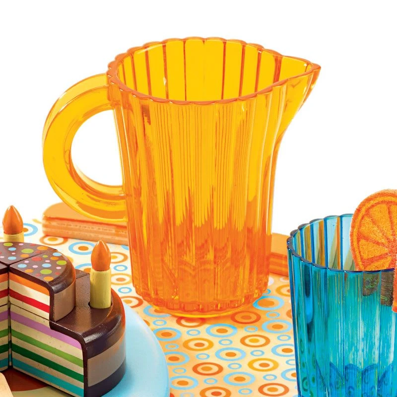 La dînette le goûter de Gaby est une dînette très colorée mélangeant bois et plastique dans un style très vintage. Elle comporte un gâteau pré coupé en 4 parts sur son plat, 1 couteau, 2 assiettes, 2 cuillères, 2 verres avec 2 rondelles d’orange, un pichet et bien sûr un plateau pour porter l’ensemble.